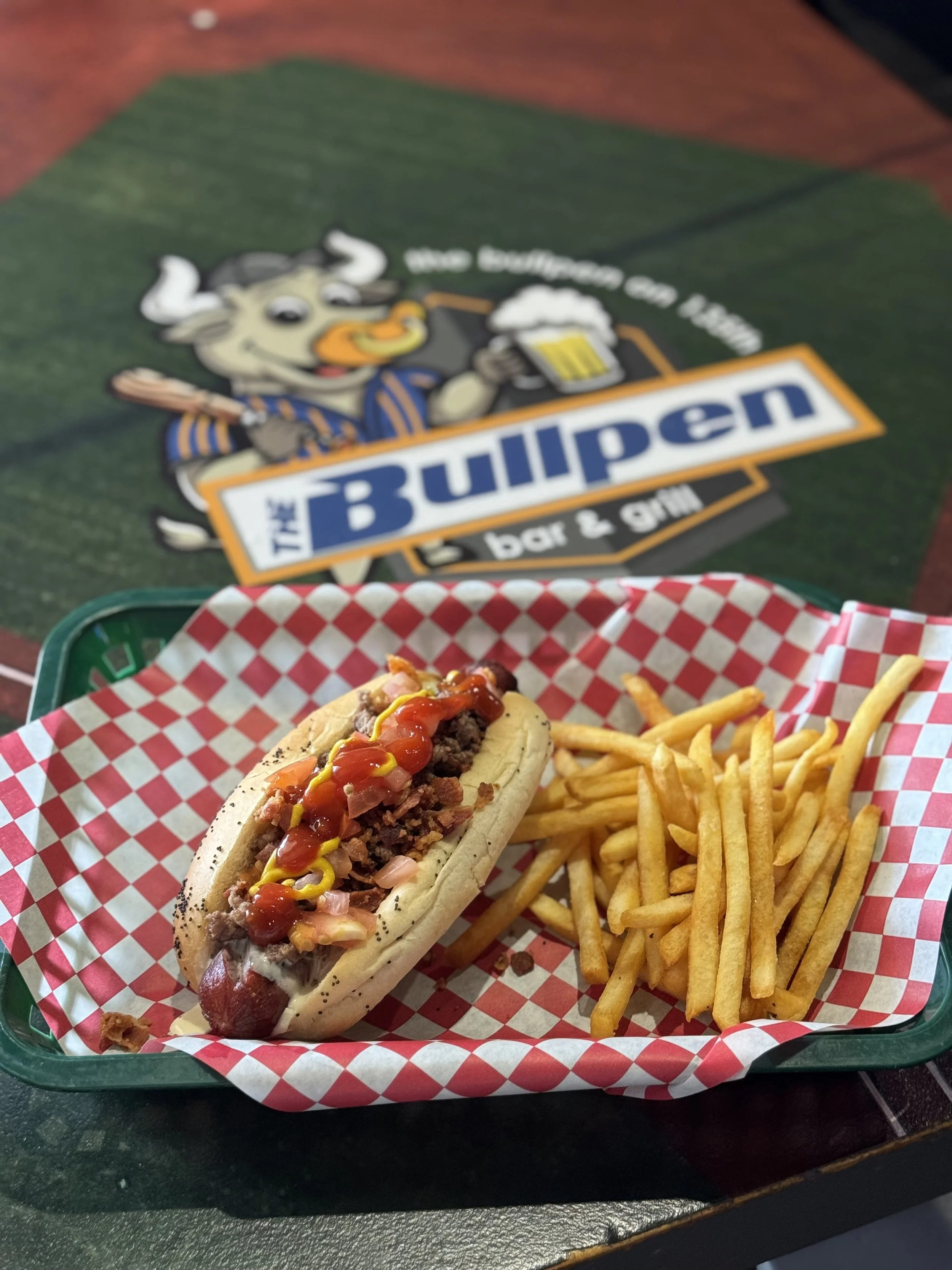 ¼ pound all beef hot dog, mustard, chili, onions & cheese