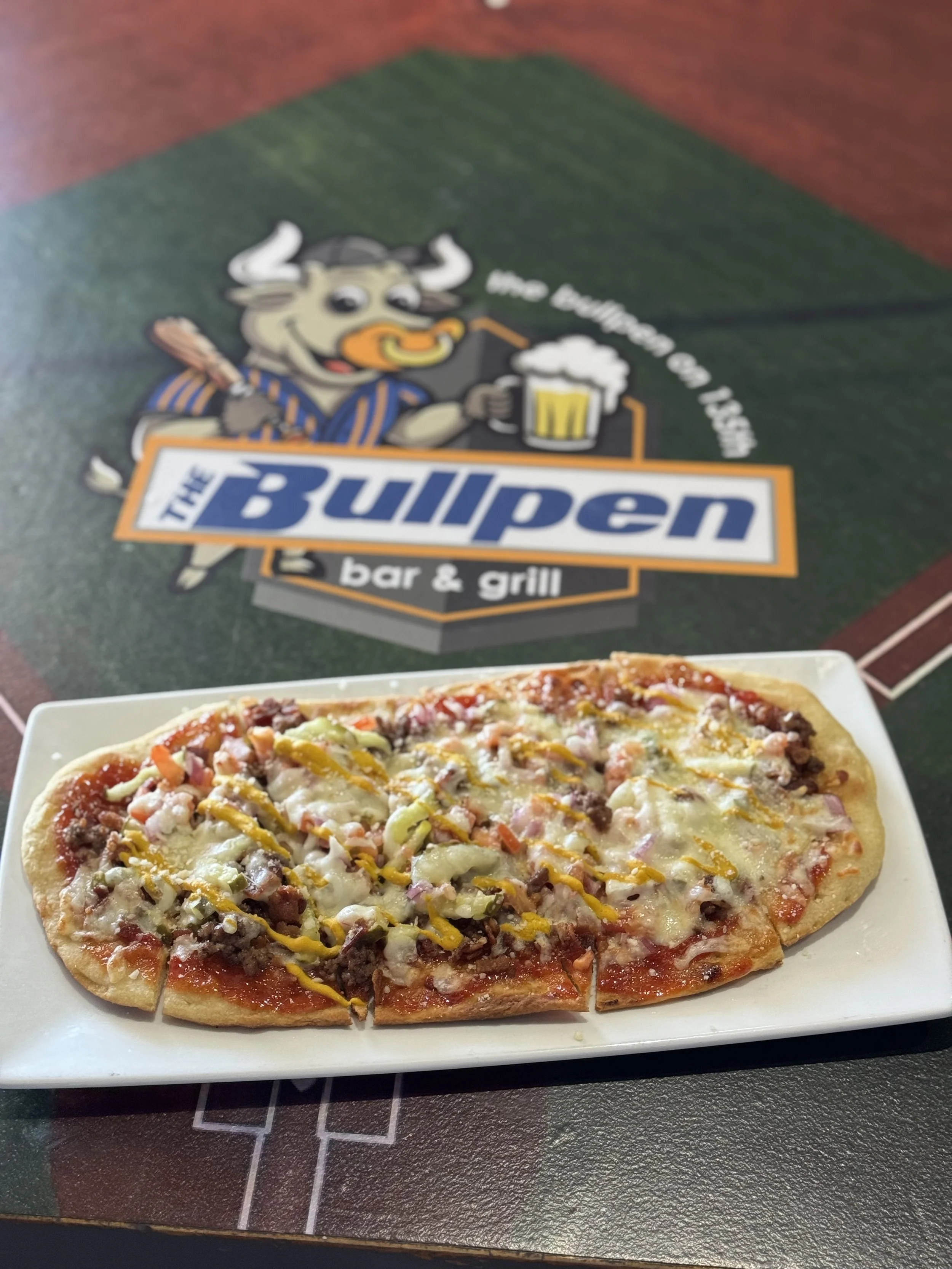Ketchup spread, mixed cheese blend, hamburger, bacon, onions, and pickles topped with a swirl of mustard and ketchup