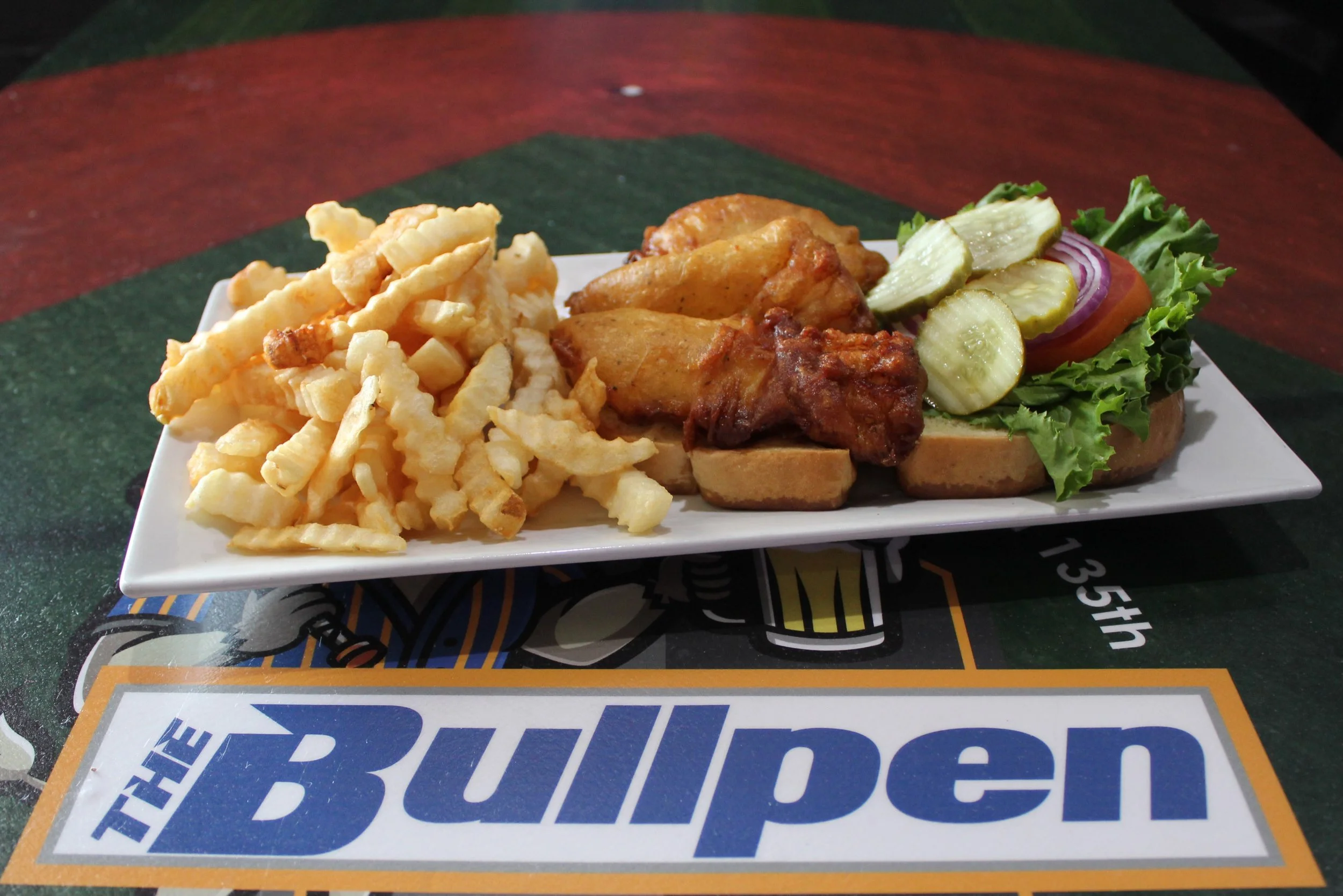 Feed the team with this giant, hand-breaded pork loin served on a toasted bun with lettuce, tomato, onions, and pickles