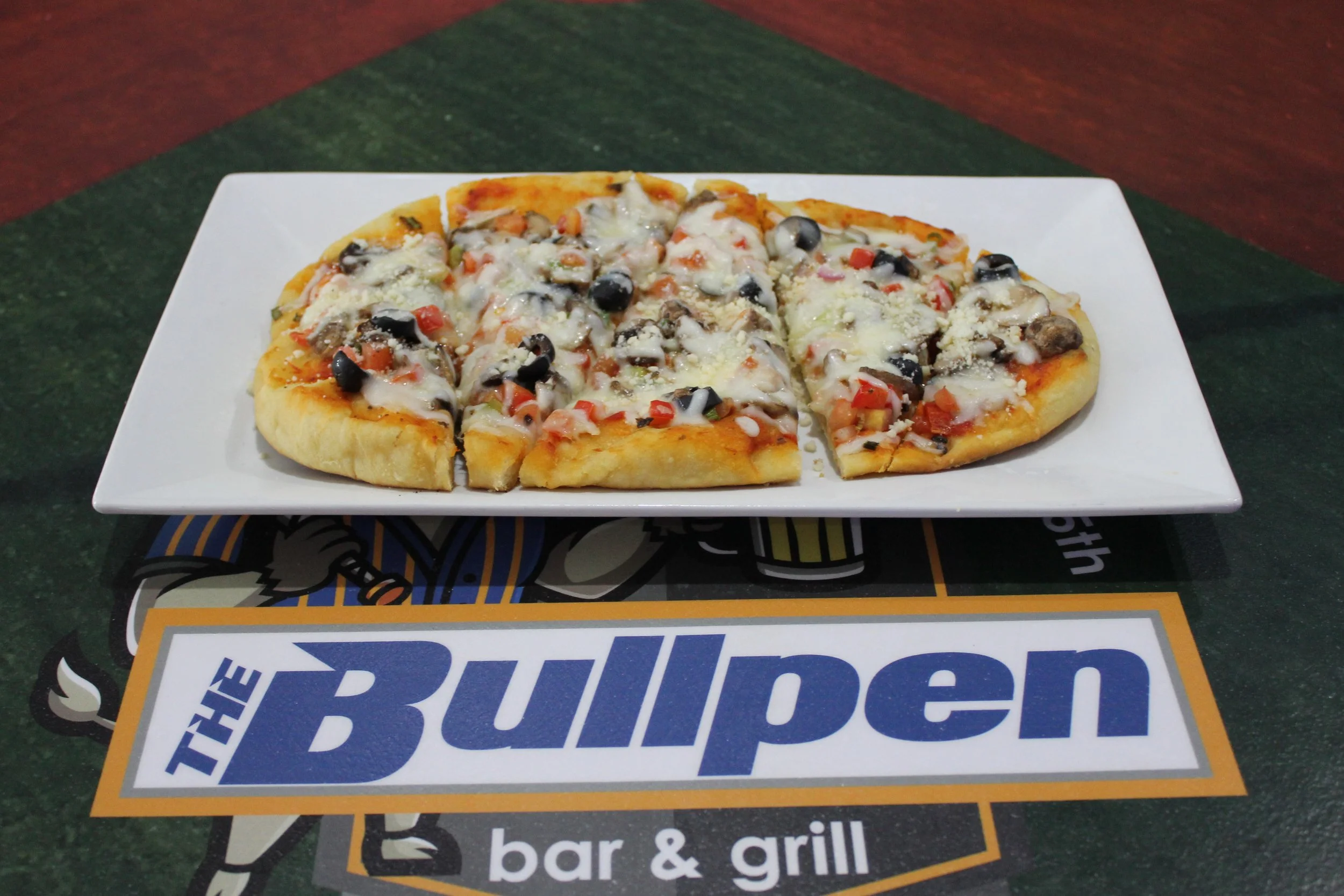 House made marinara sauce topped with mushrooms, red onions, peppers, black olives, tomatoes, and mozzarella cheese