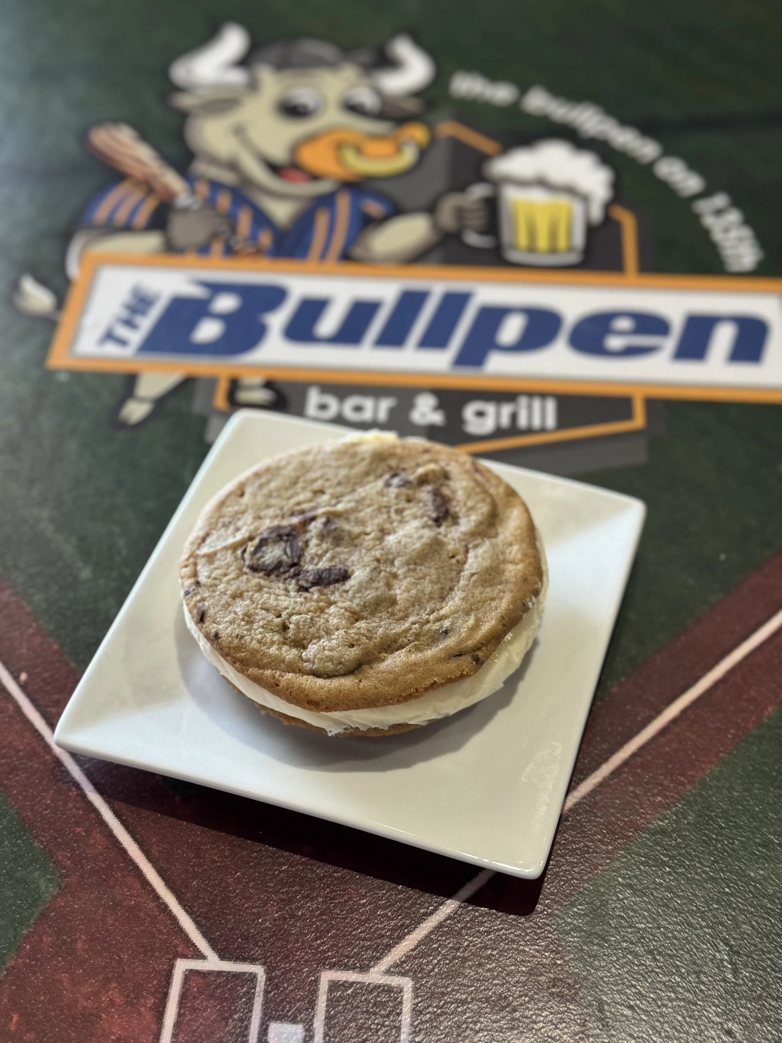 Two oversized, freshly baked chocolate chip cookies with a scoop of vanilla ice cream in between