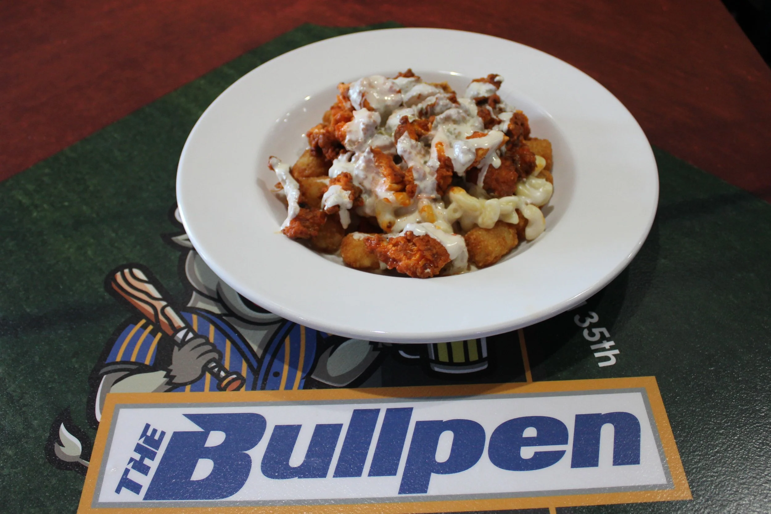 Bed of tater tots topped with fried chicken tossed in buffalo, mac & cheese, with a drizzle of queso