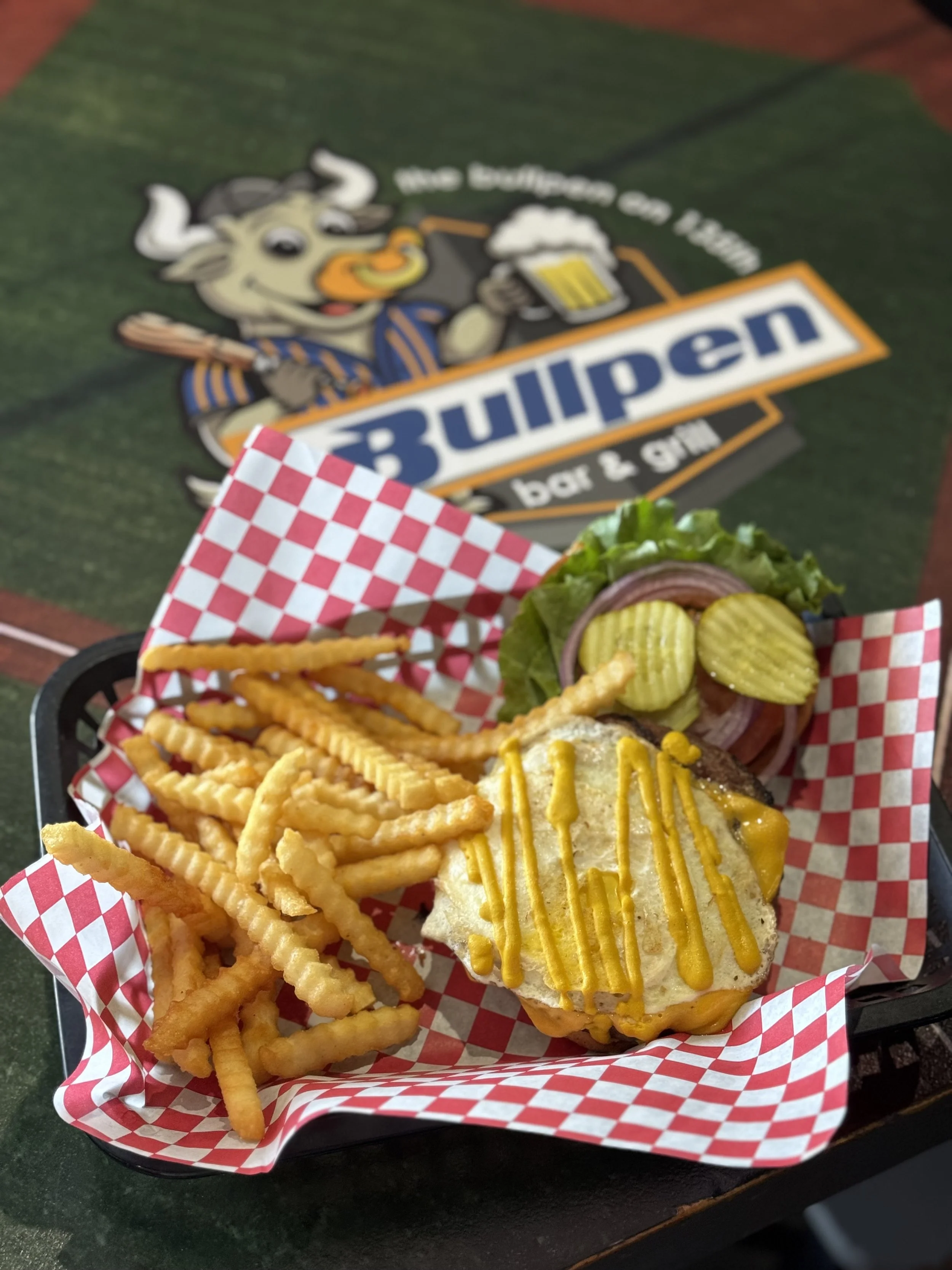 7oz burger patty, ¼ pound hot dog, cheese, onion, chili, mustard, ketchup, piled high and open faced on a brioche bun